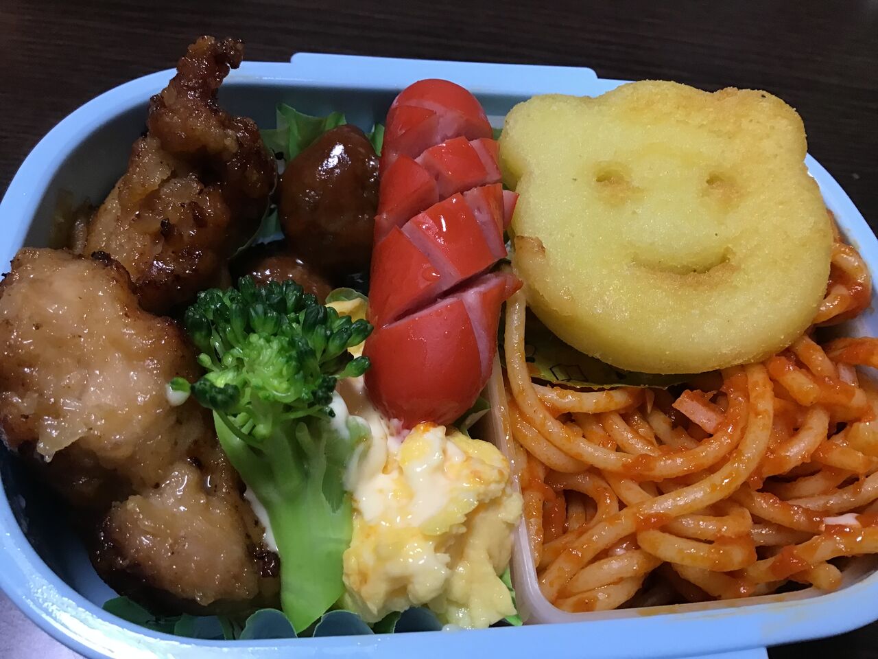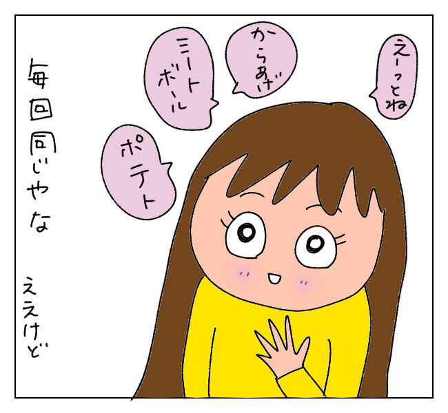 「えーっとね。唐揚げ、ミートボール、ポテト、ナポリタン」
