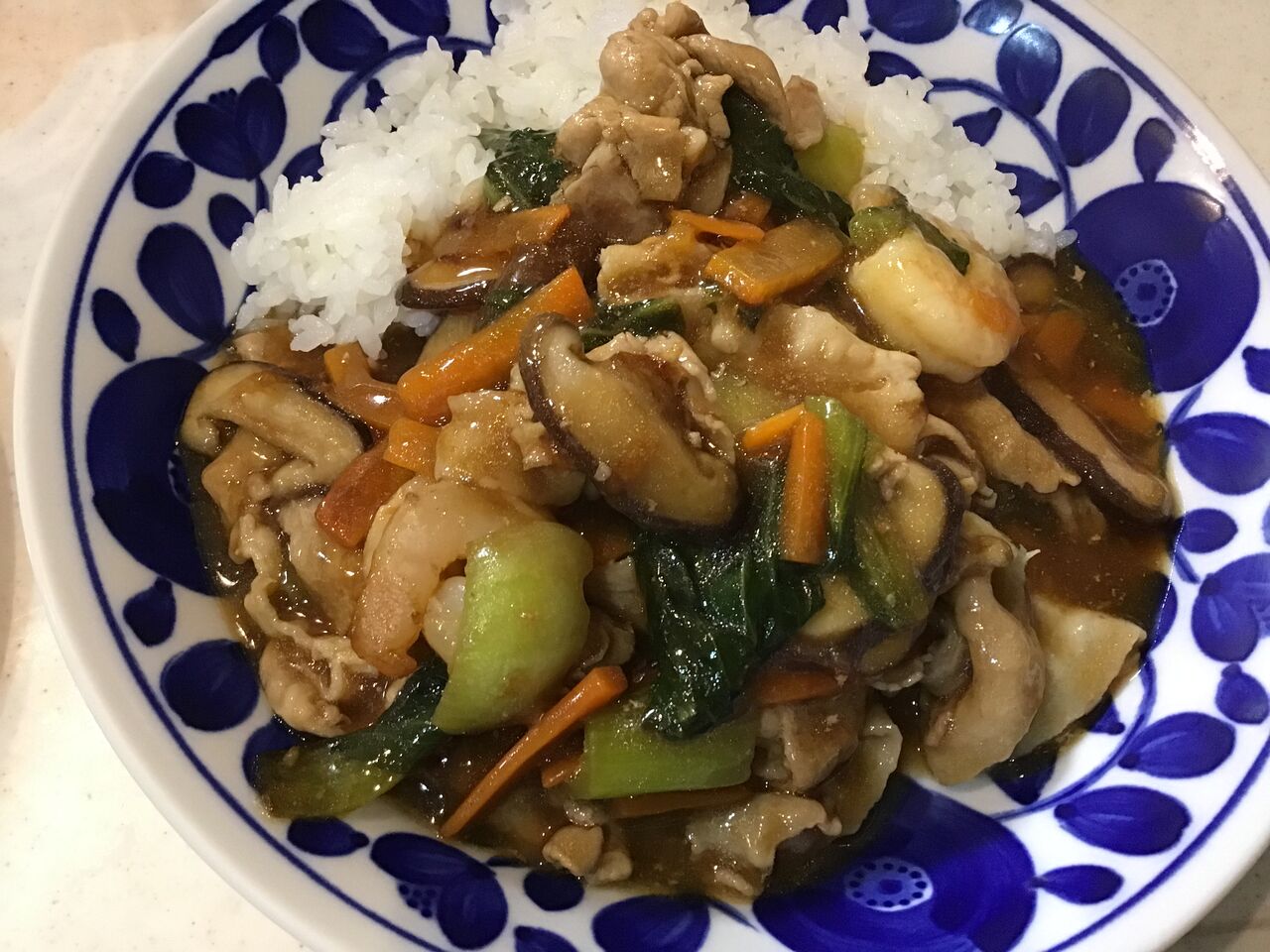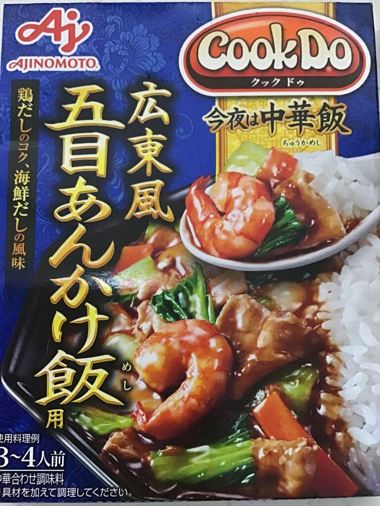 切って炒めて『広東風五目あんかけ飯用』を入れて、ご飯にかけて出来上がり。