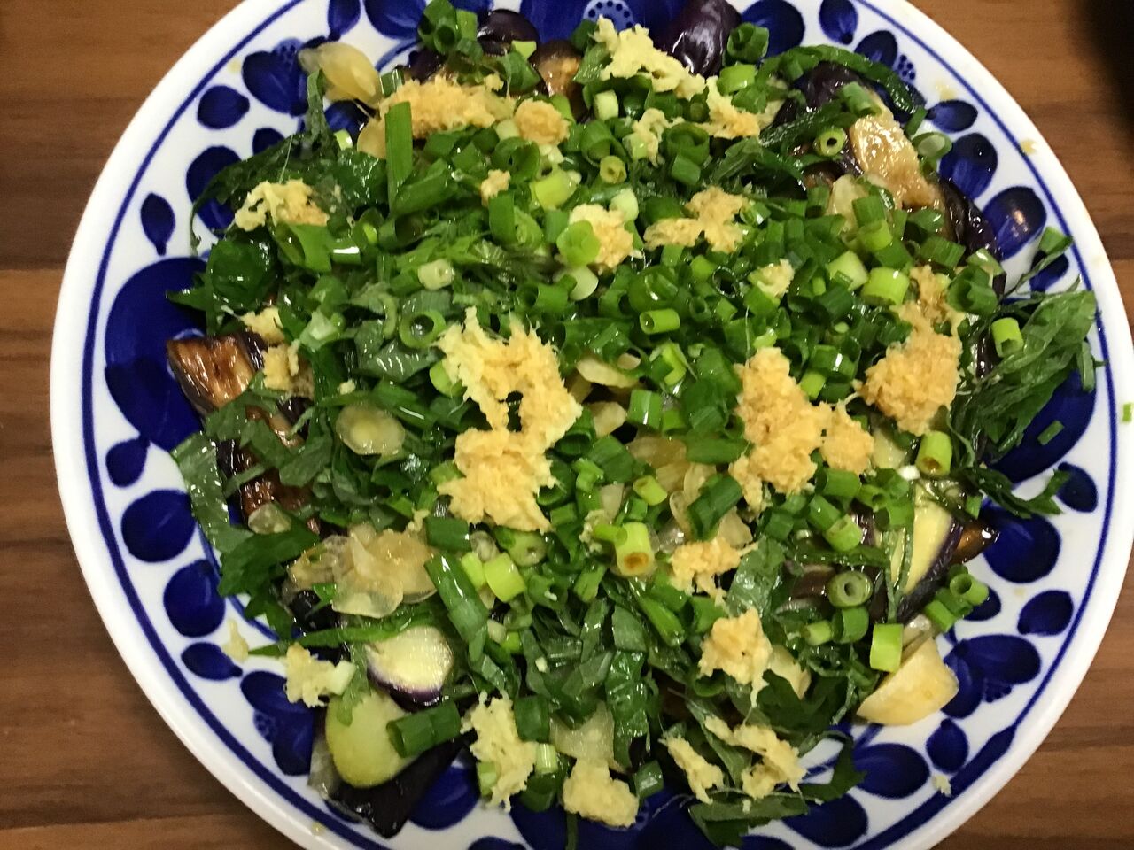 焼いたナスに薬味たっぷり乗せて食べる料理。
