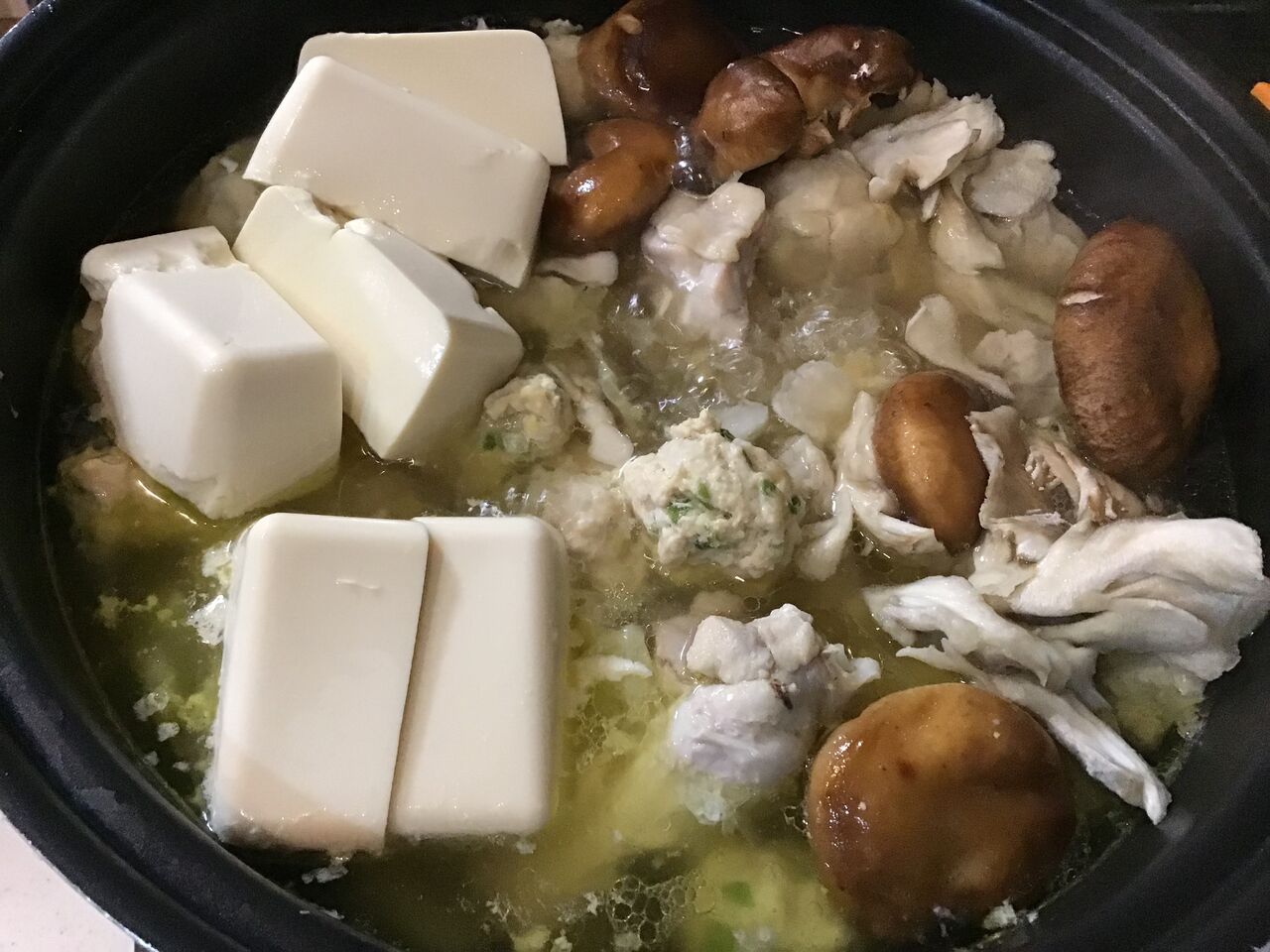 鶏手羽元、鶏もも肉、つくねを入れた鍋。