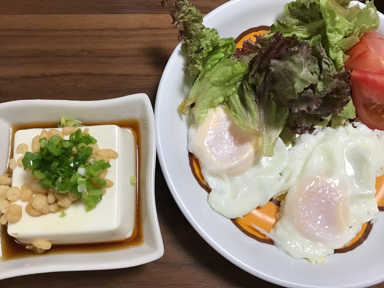 私は夜炭水化物抜きなので、目玉焼きと冷奴に。