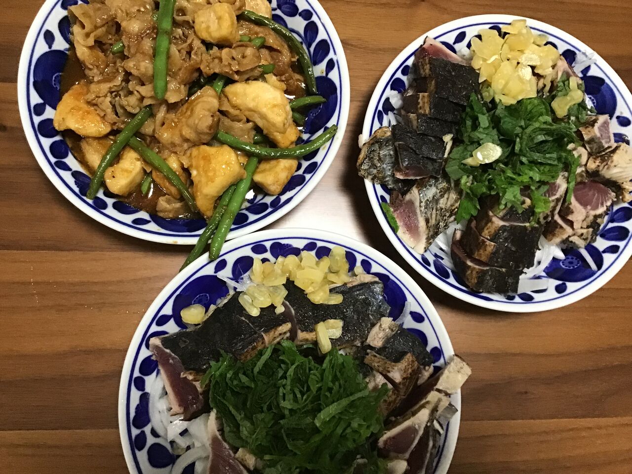 カツオのたたきの下には新玉ねぎの薄切りを敷いています。