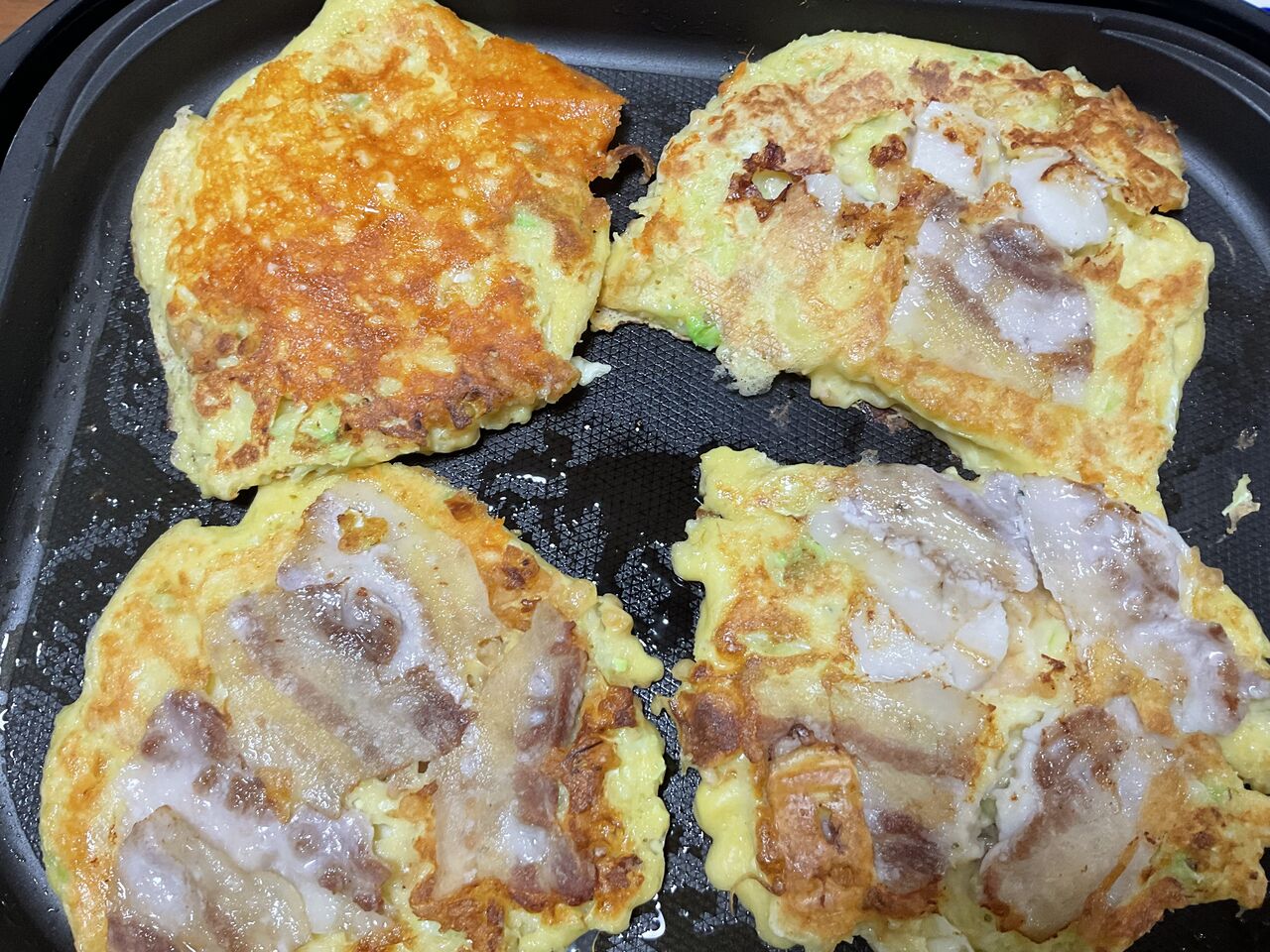 ひーちゃんはチーズお好み焼き、旦那は豚玉、私と母は豚玉にホタテも投入。